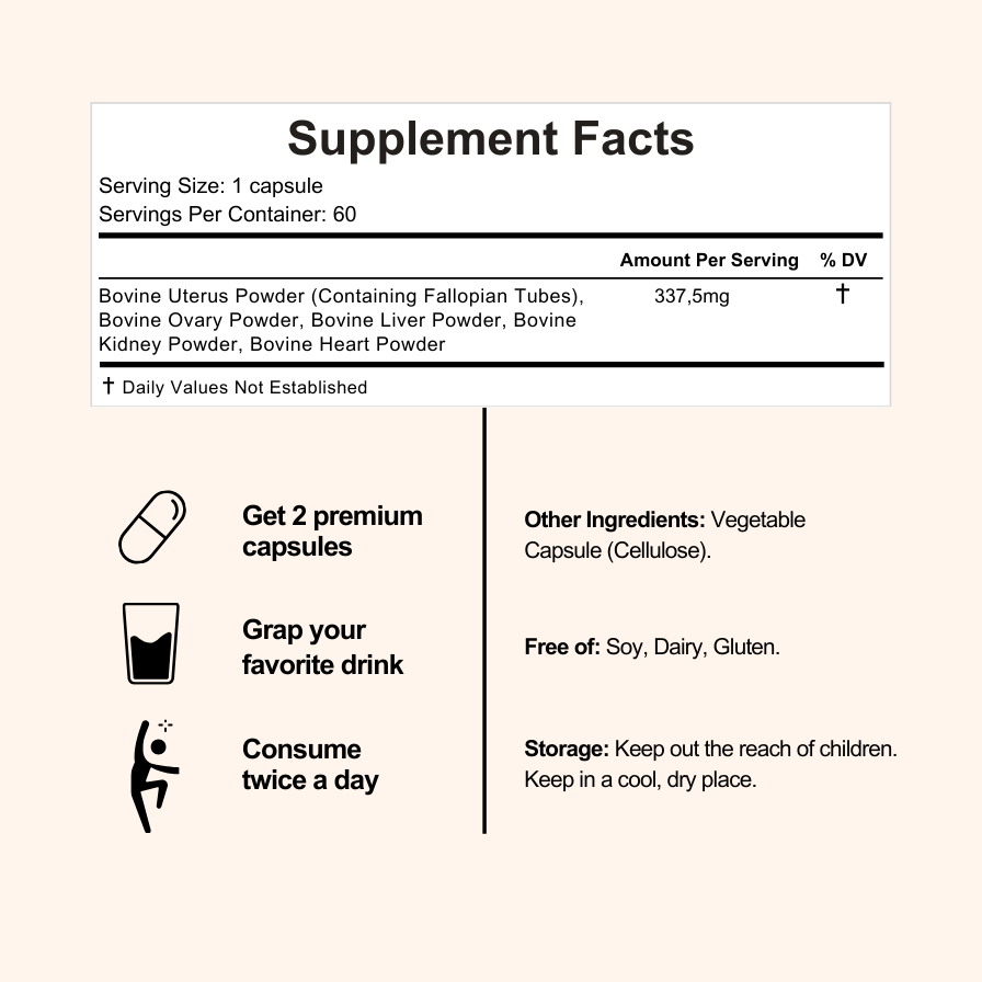 With thoughtfully selected ingredients like Bovine Liver Powder, Bovine Kidney Powder, Bovine Heart Powder, Bovine Ovary Powder, Bovine Uterus Powder, Bovine Fallopian Tubes Powder, this formula naturally supports your overall health all year-long.